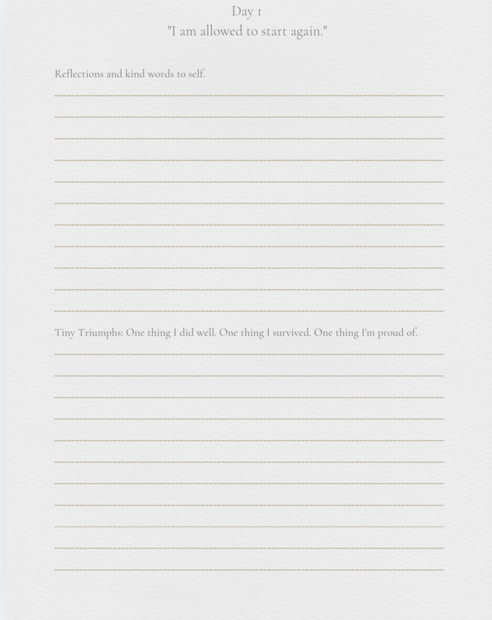 Step into 30 days of intentional self-reflection with this beautifully designed, printable journal. Created with trauma-informed compassion, each daily spread offers a soft landing place for your thoughts, emotions, and quiet victories. Whether you’re rebuilding after trauma, navigating a season of change, or simply craving deeper self-connection, this journal guides you with tenderness, not pressure.